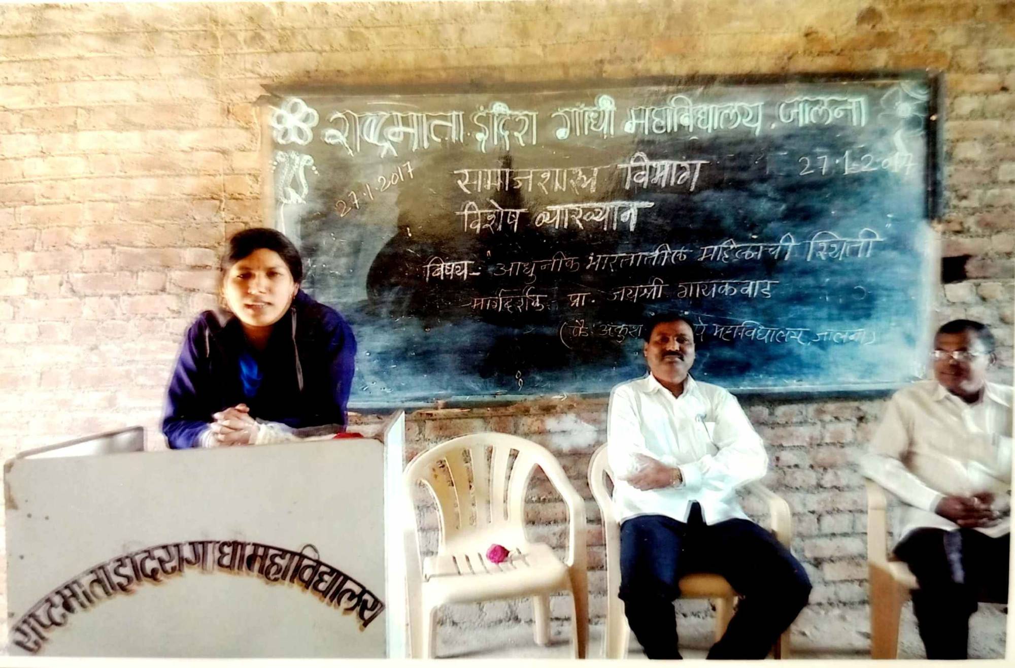 Sociology as a subject for study introduced in Rashtramata Indira Gandhi Arts, Commerce & Science College ,Jalna. from 1991, if the establishment of the college. Up to1991-92 the subject was taught at UG level as an optional subject. Sociology subject has so many branches, following different papers are taught in Sociology department at under graduate level. Introduction to Sociology, Individual and Society, Introduction to Subfields of Sociology, Indian Social Composition,